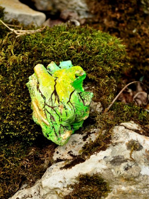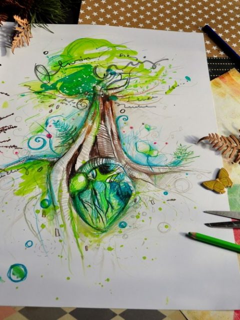 Są miejsca które dotykają nas głęboko…uwodzą niczym zmysłowy kochanek…miejsca gdzie czas przestaje istnieć a liczy się tylko ta chwila, która trwa…I niech trwa wiecznie! Tak było w St Victor w Francji…Wzgórza które przytulają jak dobry przyjaciel i snują swe zielone opowieści a ty chłoniesz to wszystko i nadziwić się nie możesz jak bogata to kraina..Tam podczas długich spacerów odnalazłam serce lasu…moje zielone uziemione serce…Namalowałam je kilka miesięcy wcześniej na ilustracji….I nawet mi się nie śniło że odnajdę je wśród paproci?