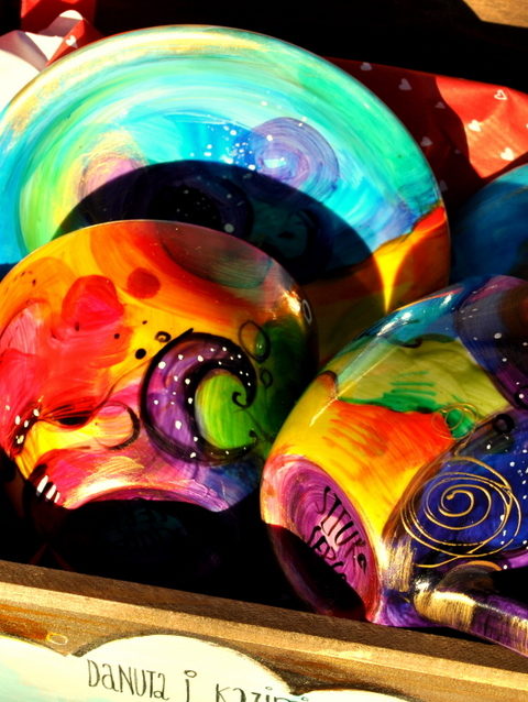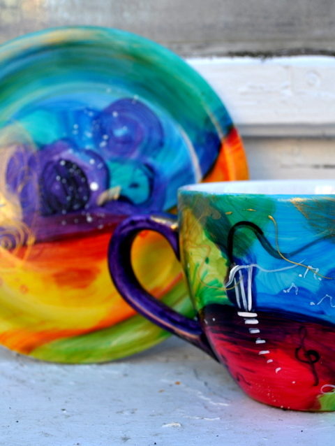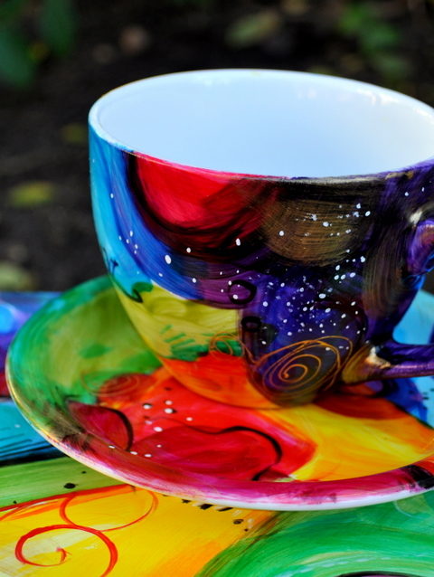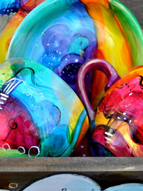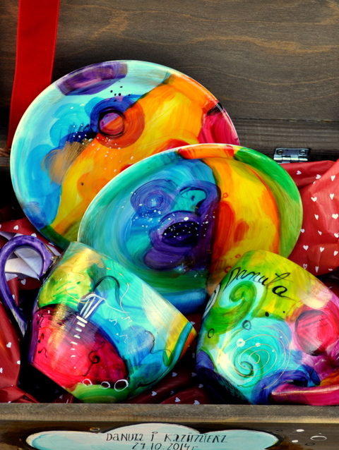Kolorowa wariacja na filiżankach zapakowana w ozdobną skrzyneczkę.