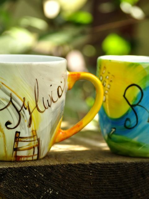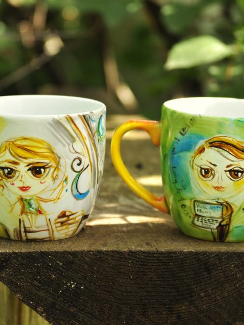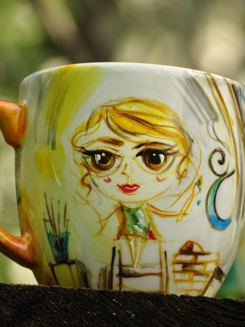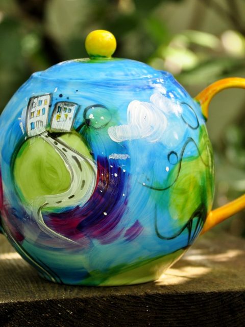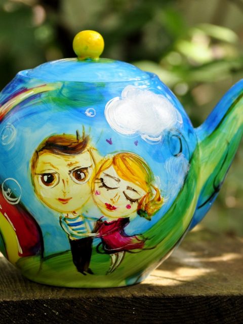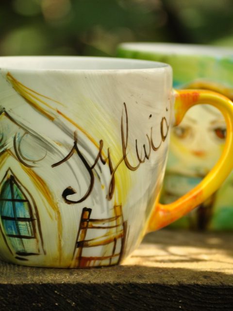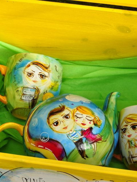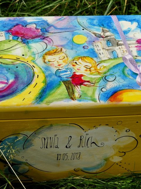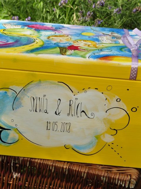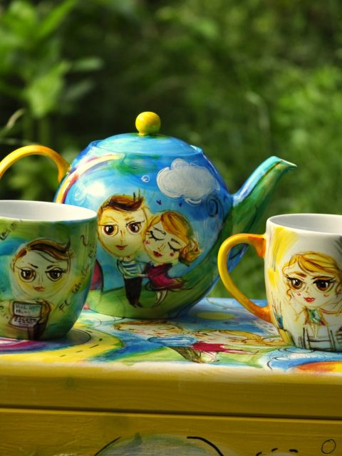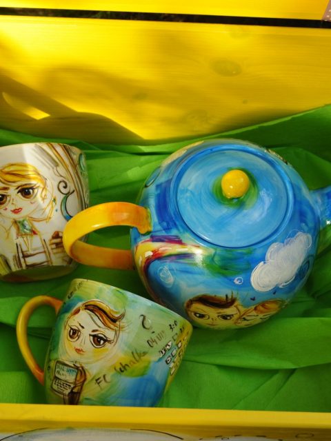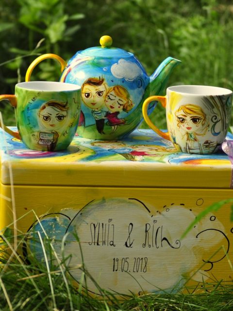 Czajnik 1,2l, 2x kubek 0,3l+ drewniana ręcznie malowana skrzynia
